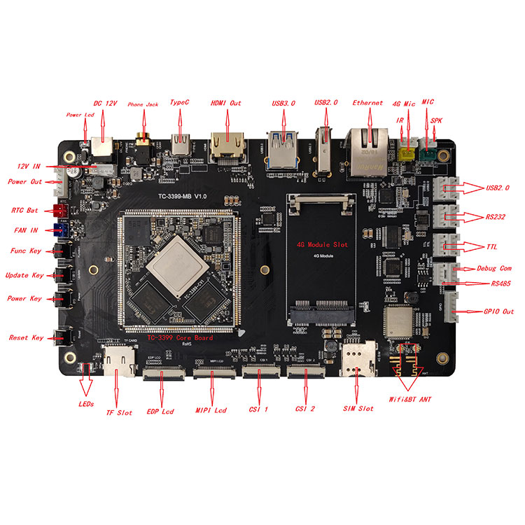Rockchip TC-3399 विकास बोर्ड TC-3399 टिकट छेद सोम र वाहक बोर्ड को हुन्छन्।